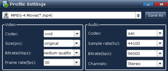 Click “Settings” and configure video and audio settings like bit rate, frame rate, video codec and so on to get the better video quality.