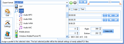 Click on the triangle button in the Export format box, select Audio, and Audio MP3: